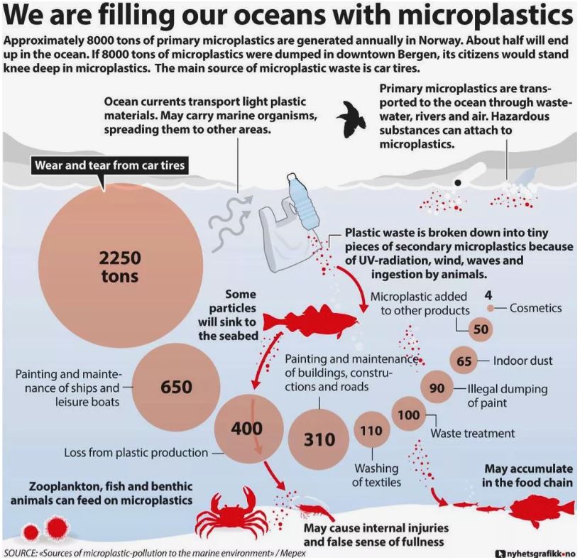 Here is an example from a study in Norway, where you seee wear and tear from Car tires is by far the largest pollutor: