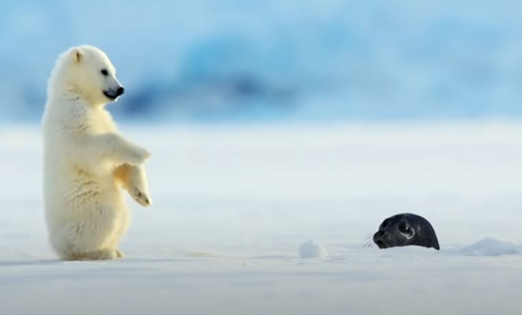 A polar bear waits patiently for a seal, but her cub is taken by surprise when it appears unexpectedly.