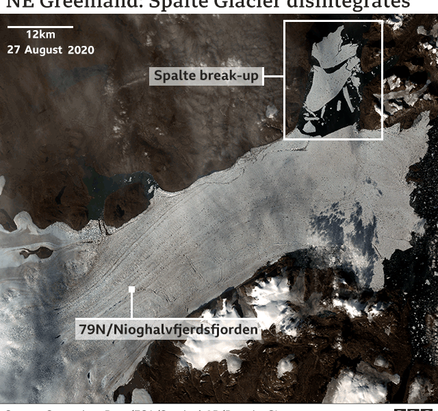 A big chunk of ice has broken away from the Arctic’s largest remaining ice shelf – 79N, or Nioghalvfjerdsfjorden – in north-east Greenland. The ejected section covers about 110 square km; satellite imagery shows it to have shattered into many small pieces. The loss is further evidence say […]